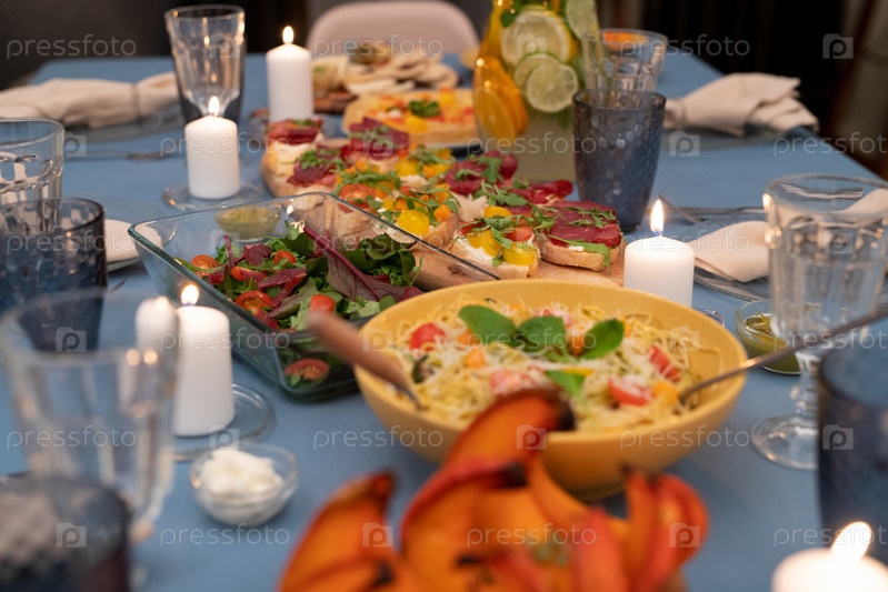 Часть праздничного стола с овощным салатами, домашними бутербродами и макаронами