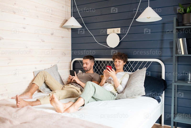 Молодые отдохнувшие муж и жена, расслабляющиеся на кровати и прокручивающие мобильные телефоны