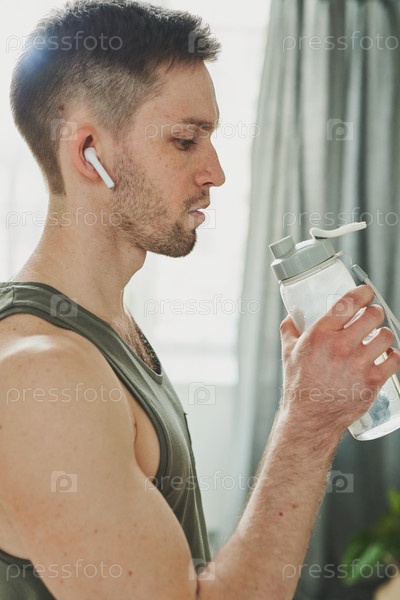 Молодой человек в наушниках и спортивном жилете держит бутылку с водой у рта