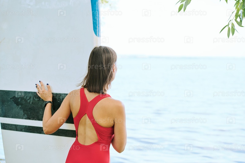 Обратный вид молодой женщины с темными волосами в красном купальном костюме, стоящей у доски для серфинга
