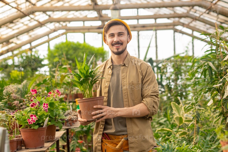 Счастливый парень выбирает растение в питомнике