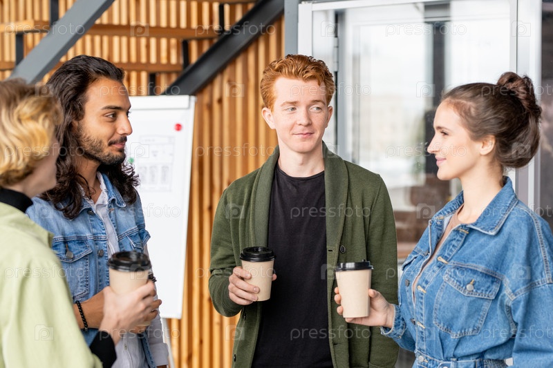 Группа молодых межкультурных офис-менеджеров или креативных дизайнеров, выпивающих