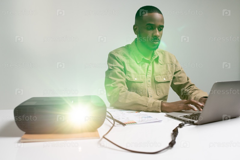 Серьезный афроамериканский бизнесмен готовится к предстоящей конференции