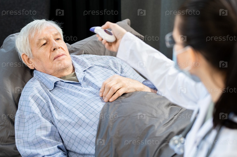 Больной пожилой мужчина смотрит на молодую женщину-врача с помощью бесконтактного термометра