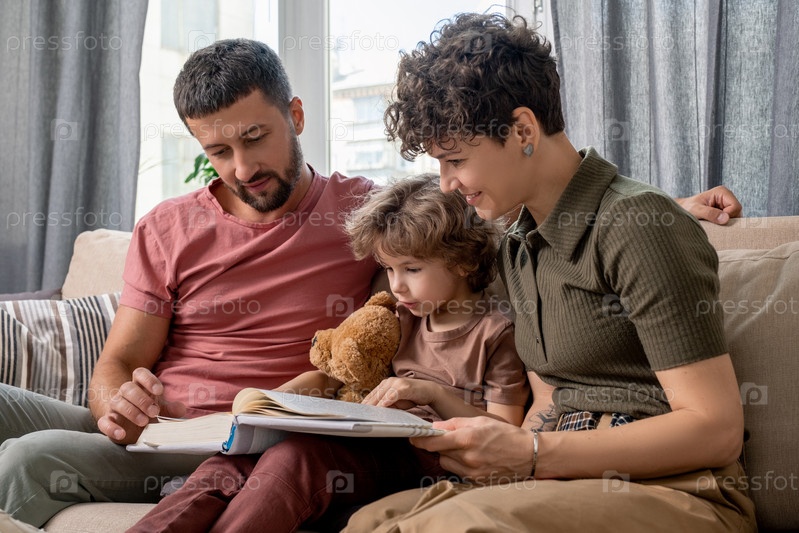 Счастливая семья отца, матери и маленького сына с тедди читает книгу сказок