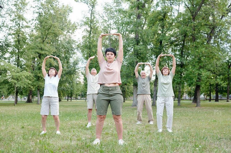 Растягивание тела на занятиях фитнеса на открытом воздухе