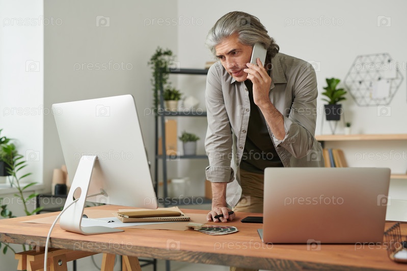 Опытный зрелый дизайнер, опирающийся на стол и смотрящий онлайн-макет во время разговора с клиентом по мобильному телефону в домашнем офисе