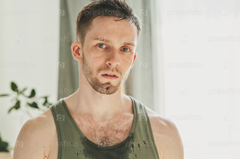 Молодой потный спортсмен в жилете стоит перед камерой после тренировки