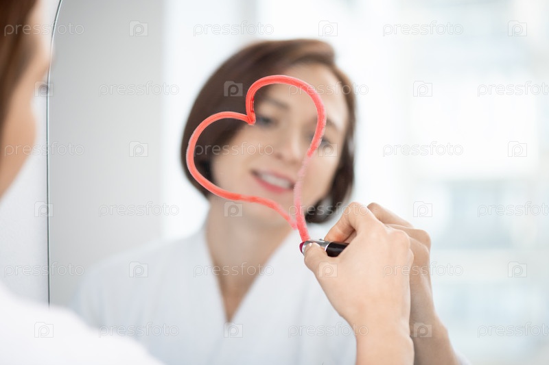 Отражение молодой брюнетки женщины в белом халате, рисующей сердце на зеркале