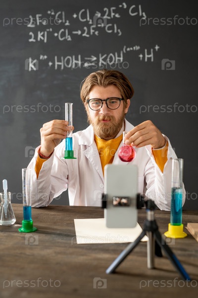 Учитель химии показывает химическую реакцию при смешивании жидких веществ
