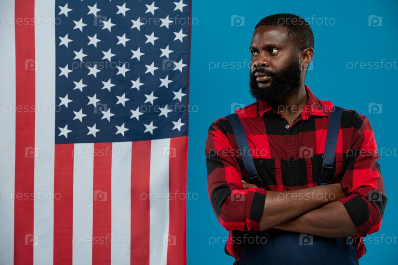 Молодой бородатый афроамериканский рабочий в фланеле с перекрещенными руками у груди