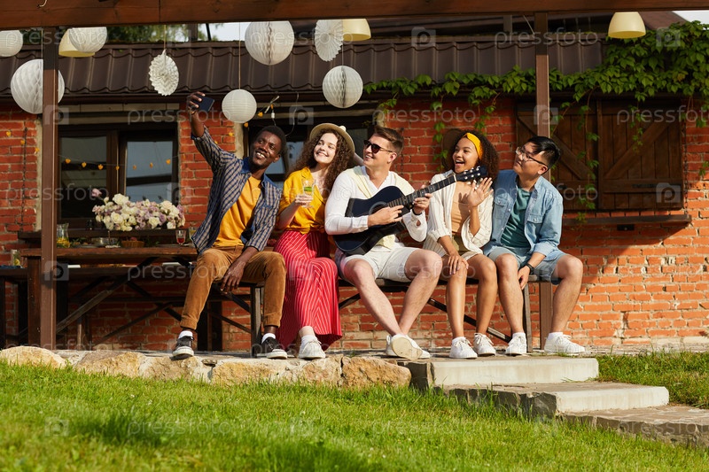 Друзья делают селфи на летней вечеринке на открытом воздухе