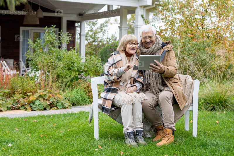 Веселые пожилые муж и жена с цифровым планшетом сидят на белой скамейке
