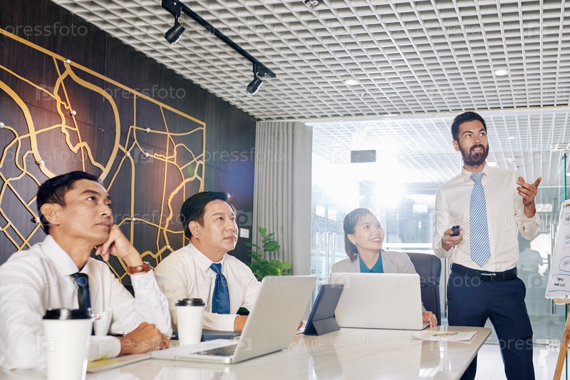 Бизнесмен разговаривает перед коллегами