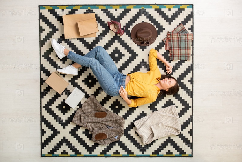 Вид на молодую счастливую женщину, окруженную новой умной повседневной одеждой, лежащей на ковре