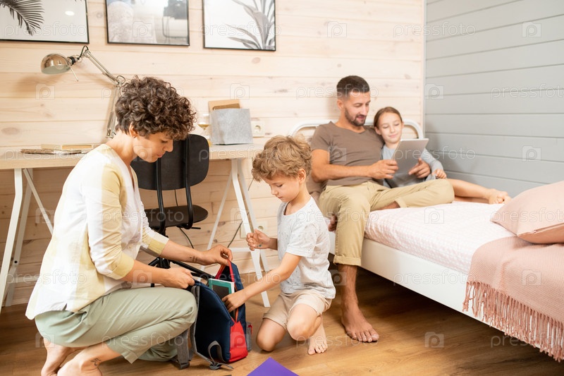 Молодая брюнетка помогает своему маленькому сыну упаковать школьный рюкзак