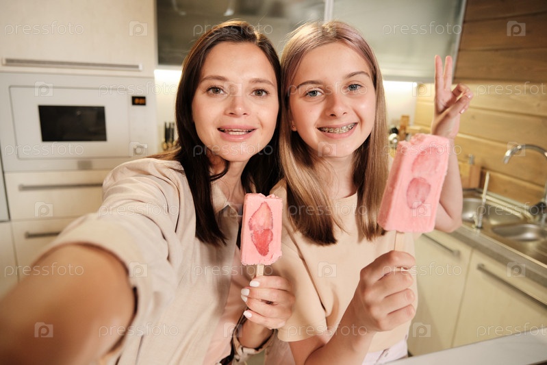 Довольно веселые женщины делают селфи, имея домашнее клубничное мороженое