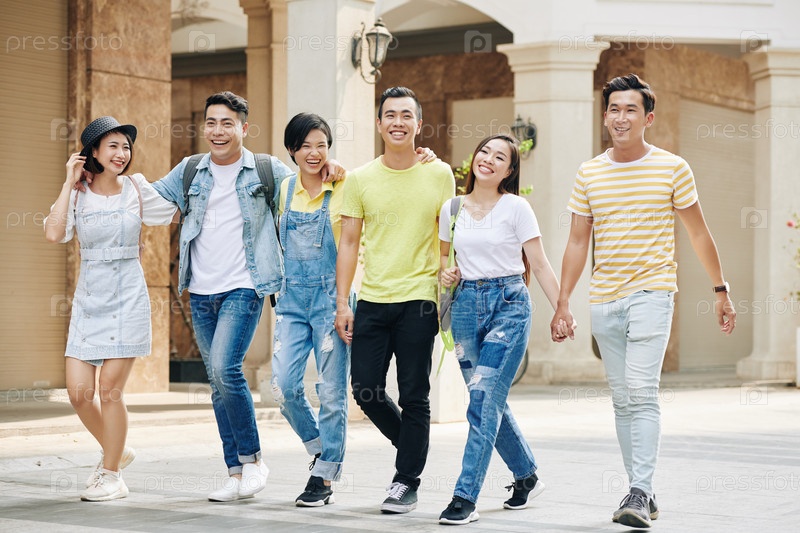 Счастливые друзья, идущие по улице