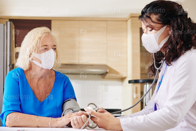Врач в медицинской маске проверяет кровяное давление