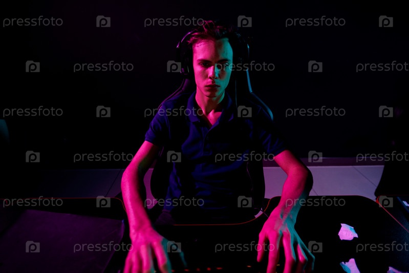 Молодой геймер играет в темной комнате