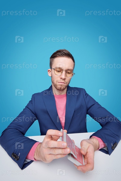 Серьезный молодой человек в формальной одежде и очках смешивает игральные карты за столом