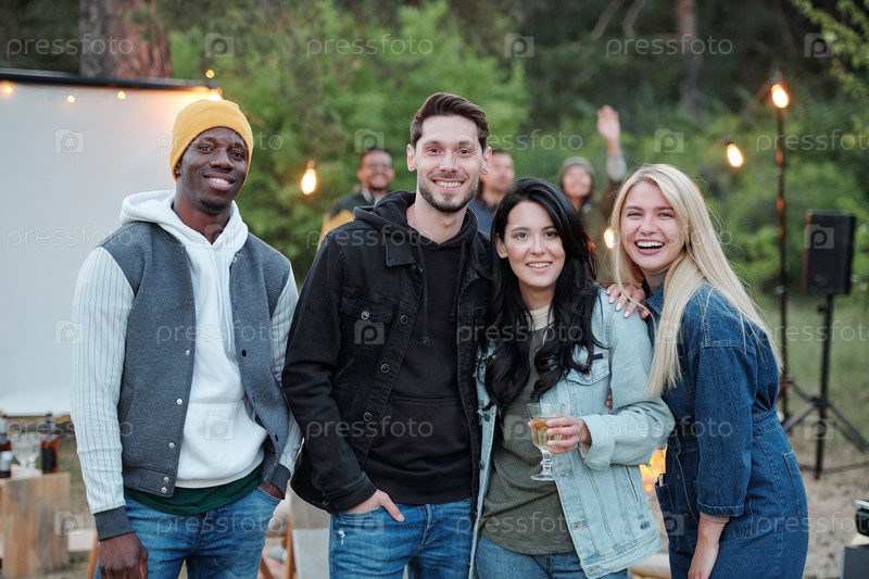 Взволнованные межкультурные молодые друзья в повседневной одежде стоят перед камерой