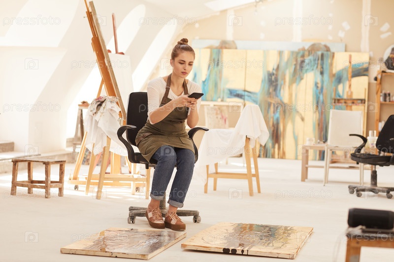 Художница фотографирует картины в студии