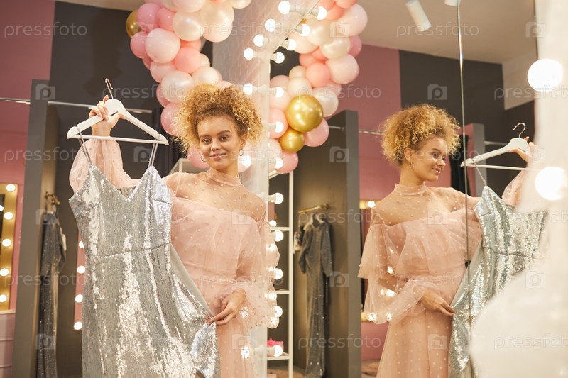 Молодая женщина держит платье для вечеринки в бутике