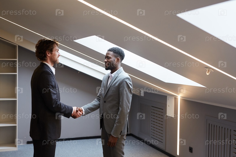 Бизнес-партнеры пожимают друг другу руки в пустом офисе