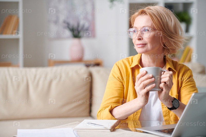 Спокойная зрелая женщина с короткими светлыми волосами пьет кофе, работая удаленно