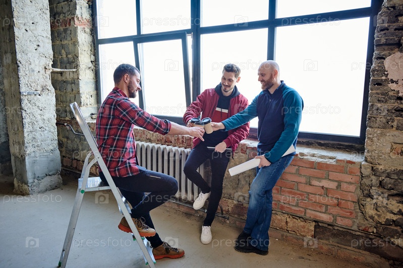 Три молодых инженера, стучащиеся со стаканами кофе после новой сделки с клиентом