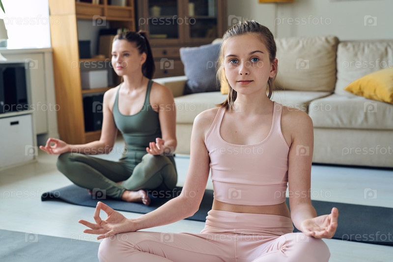 Довольно активный подросток в розовом спортивном костюме медитирует с матерью в гостиной