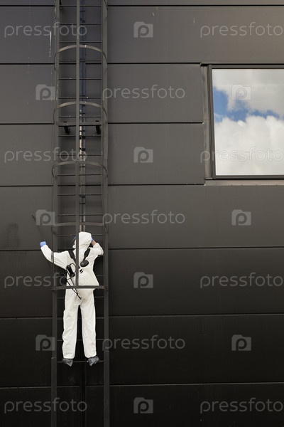 Abstract Background of Работник, дезинфицирующий черный фасад