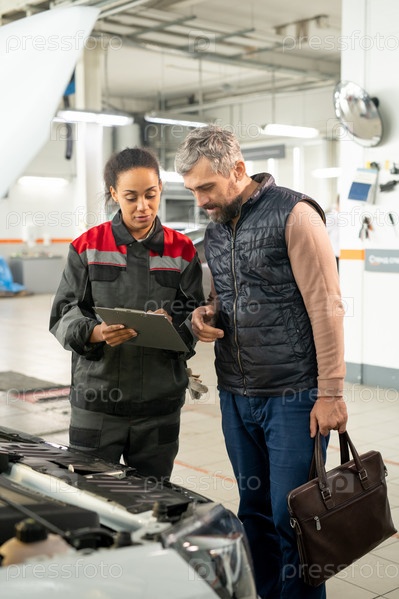 Молодая женщина-техник авторемонтного сервиса, консультирующий клиента по открытому двигателю