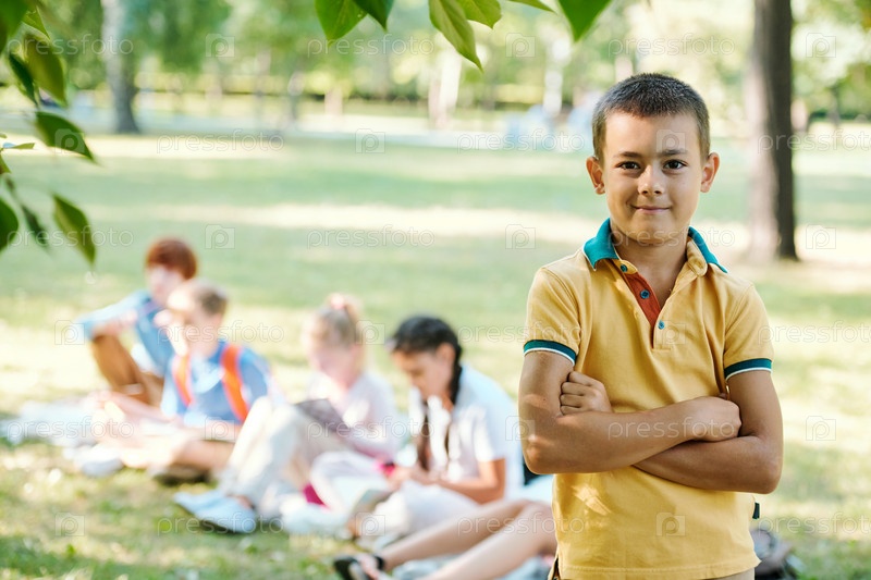 Школьник улыбается перед камерой на открытом воздухе