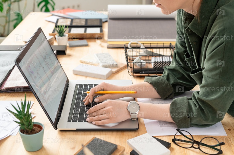 Молодая креативная женщина-дизайнер наклоняется над столом перед ноутбуком