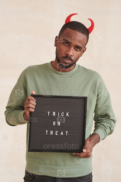 Портрет серьезного красивого дьявольского парня с красными рогами, показывающего знак во время просьбы о угощениях на Хэллоуин