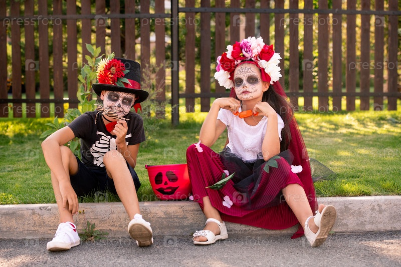 Дружеская девушка и мальчик в костюмах Хэллоуина сидят на дороге перед камерой