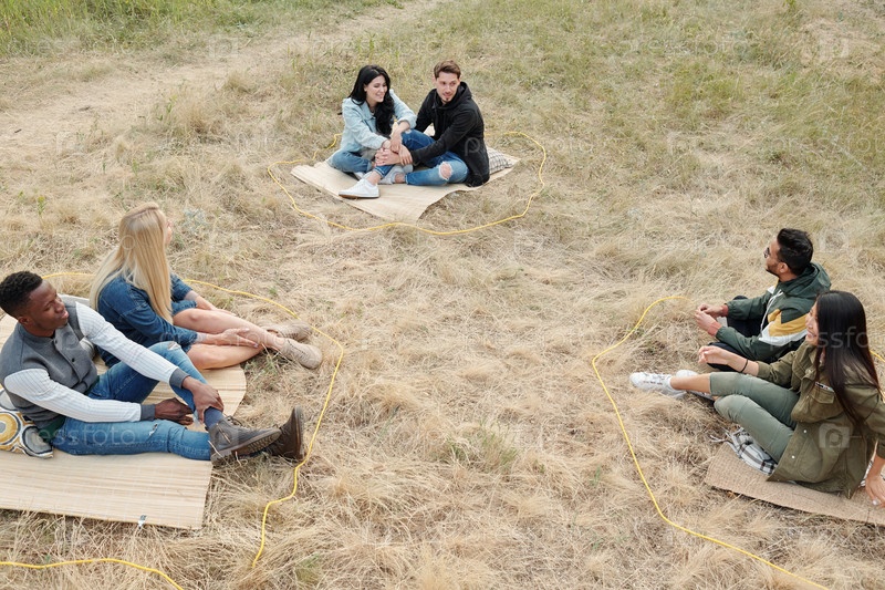 Три межкультурные пары сохраняют социальную дистанцию, сидя на сухой траве