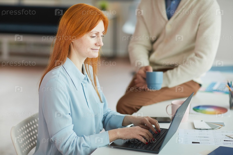 Улыбающаяся рыжеволосая женщина использует ноутбук