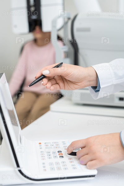 Руки молодой современной женщины-офтальмолога с ручкой, указывающей на дисплей