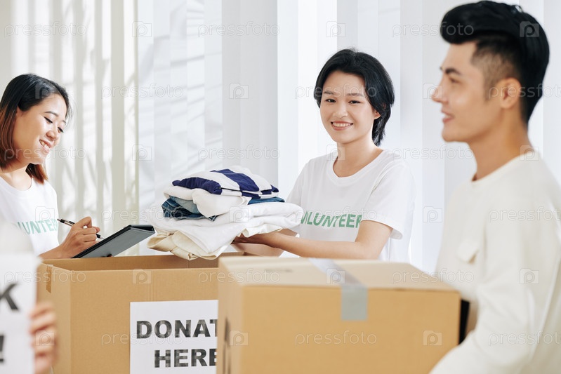 Волонтеры заполняют картонные коробки