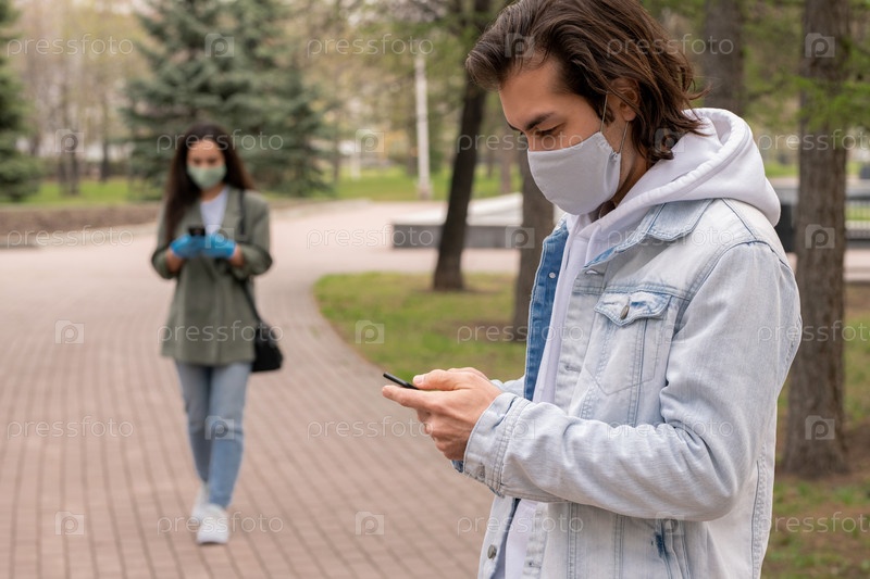Современный молодой человек в защитной маске, использующий смартфон в общественном парке