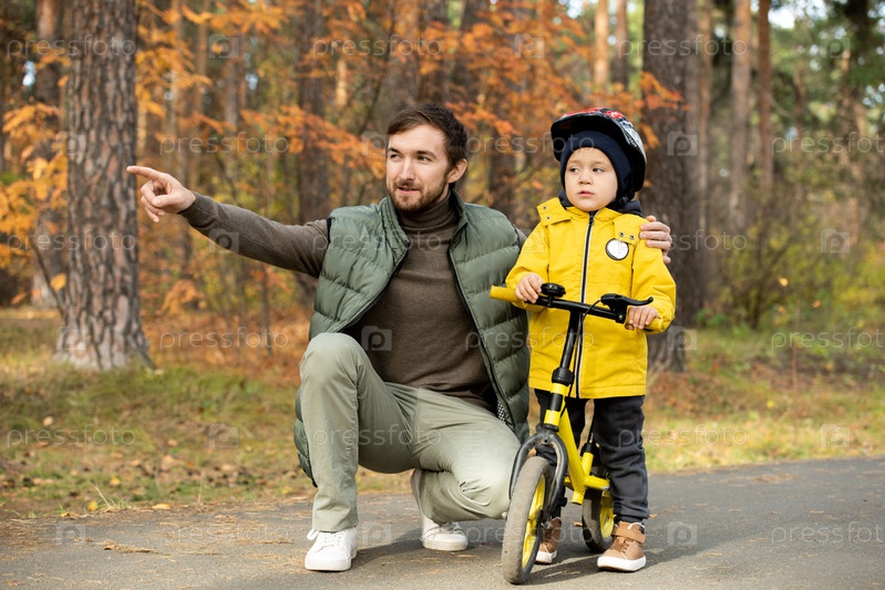 Счастливый молодой бородатый мужчина указывает вперед, приседая рядом со своим милым маленьким сыном