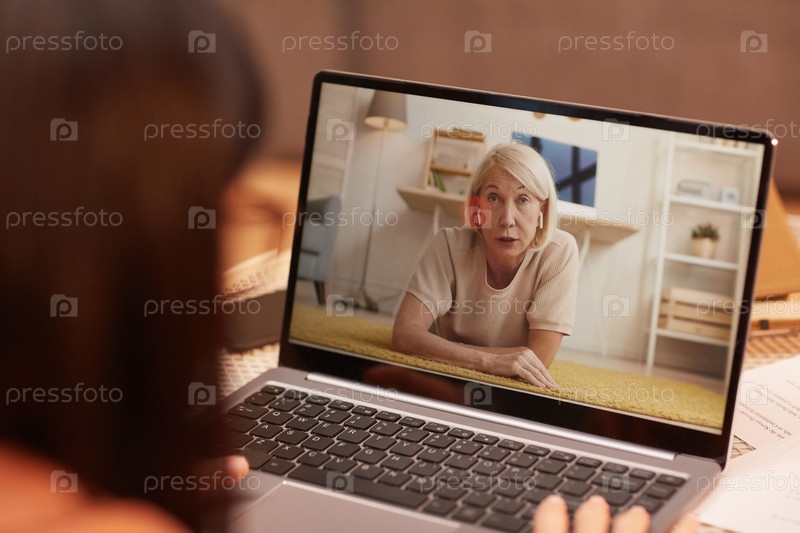 Современная зрелая женщина разговаривает с семьей в видеочате