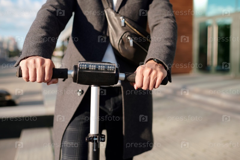 Руки молодого элегантного бизнесмена в пальто, держащегося за ручки скутера