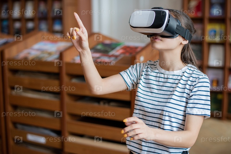 Умный современный студент колледжа с VR гарнитурой, указывающей на виртуальный дисплей