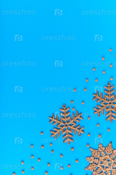 Flatlay серебряных декоративных снежин на синем фоне с copyspace