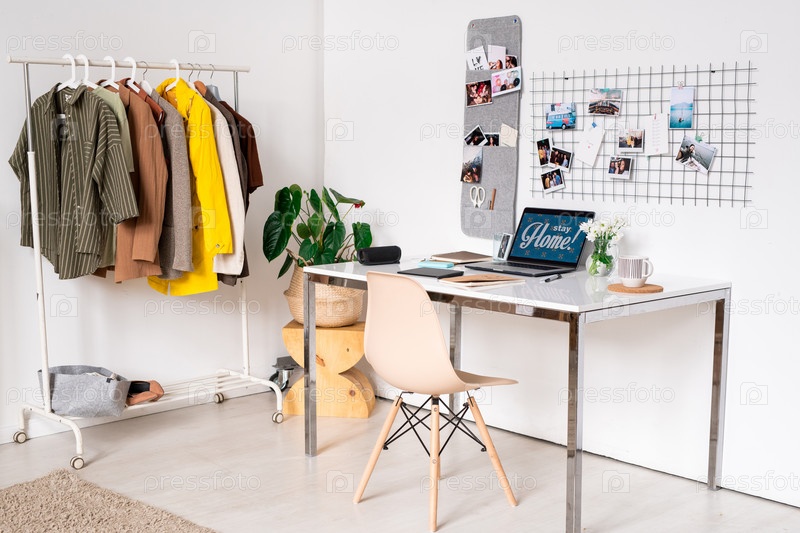 Рабочее место современного модного дизайнера с принадлежностями на столе и стойке
