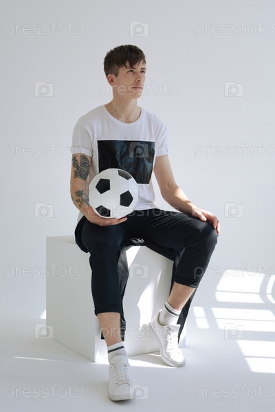 Футбольный игрок позирует с мячом